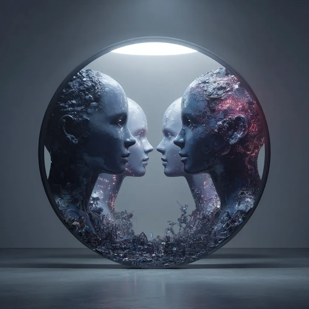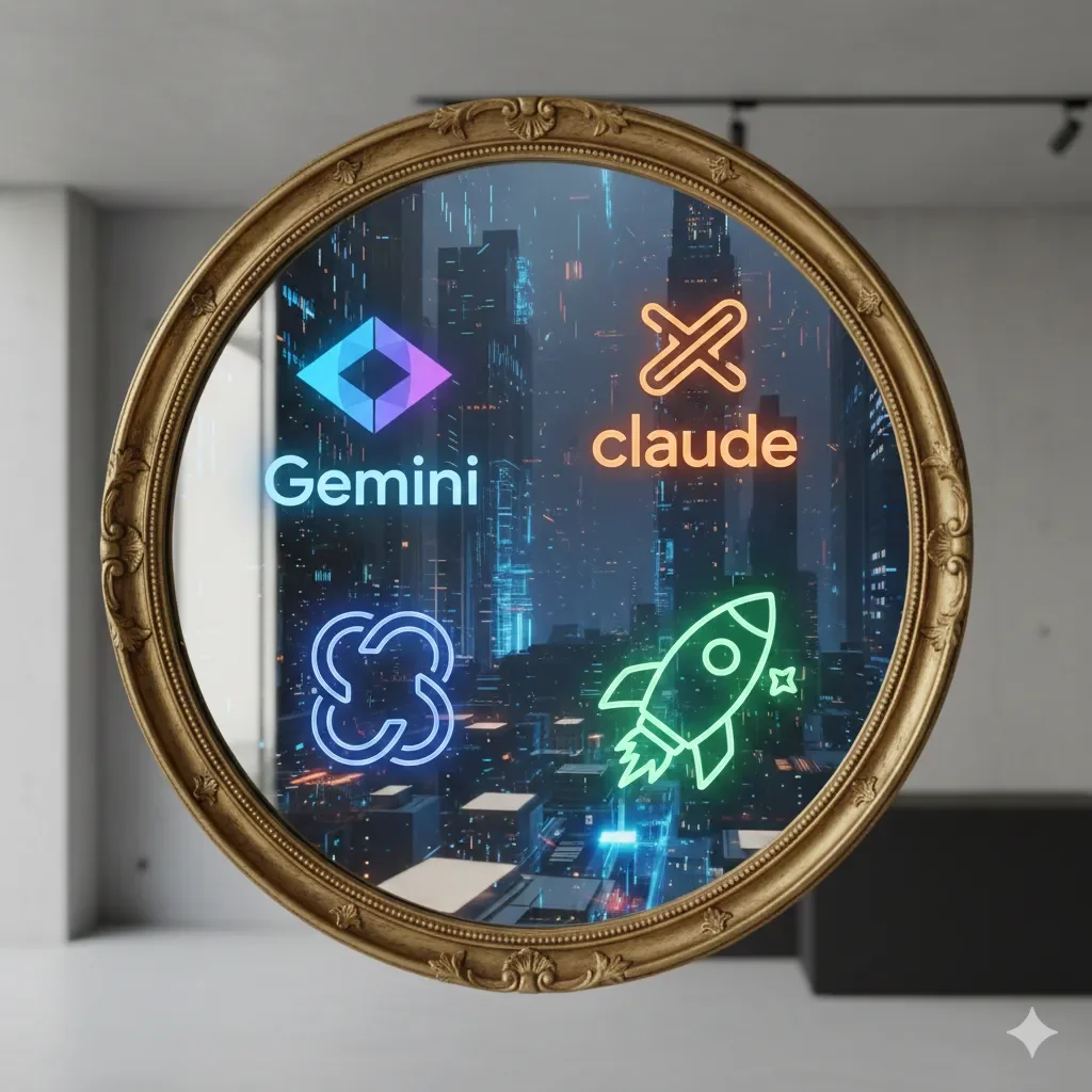 Midjourney to prompt “mirror with Open AI, Grok, Gemini and Claude logos”