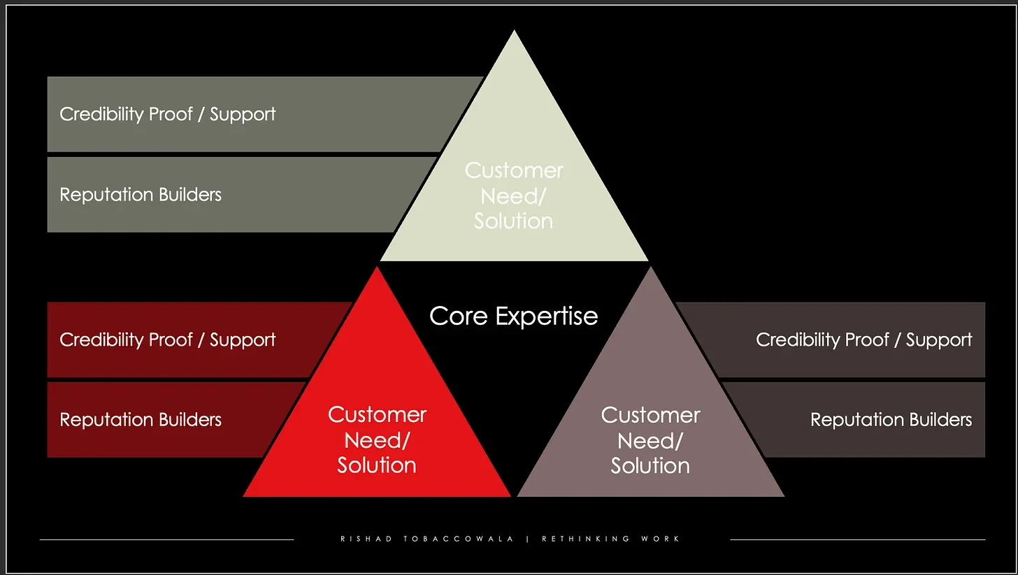 Once you have a core expertise it is important to reframe the expertise in ways that specifically address or solve customer needs. Ideally consider 3 ways you can express your expertise to meet market needs.