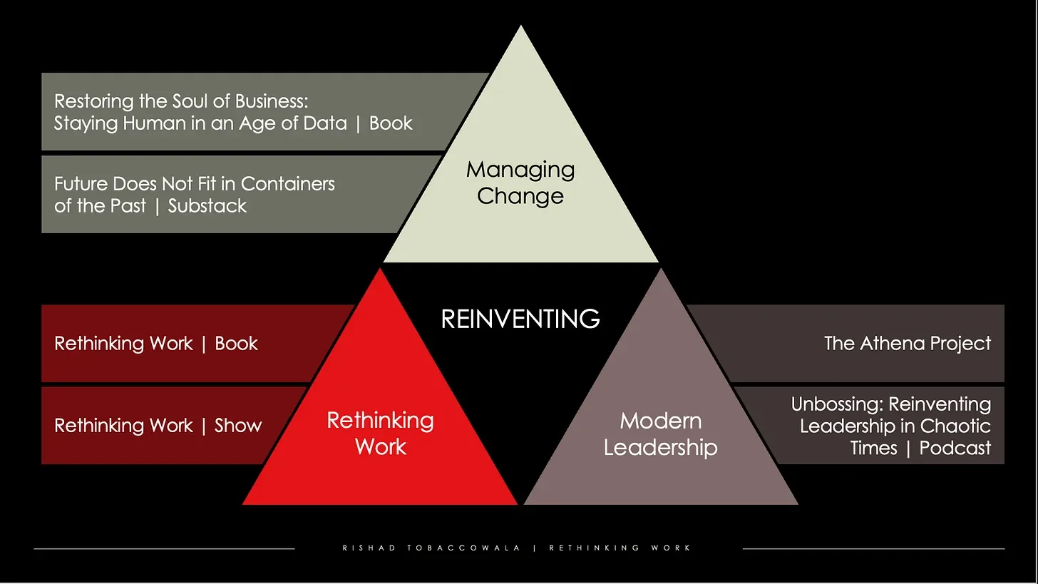 b) Rethinking Work: Companies need to get work done. Yesterday’s models centered primarily on offices, full-time jobs and many types of old scale are all in rapid decline due to a number of seismic shifts including generational ruptures, AI, the rise of gig work and much more. How should a company or a firm look for an AI First/Talent Anywhere Age while preserving quality, culture and competitive advantages?
