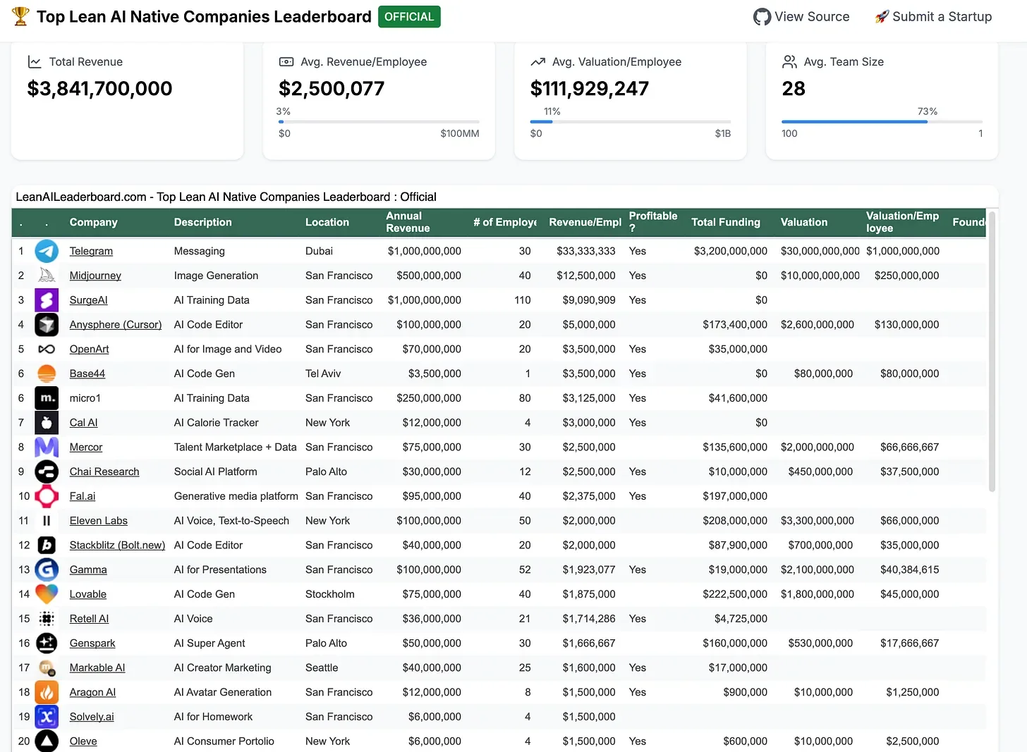 Above is a chart from Leanleaderboard.com (see above) showing that the revenue per employee for AI focused firms which is just under 2.5 million dollars per employee