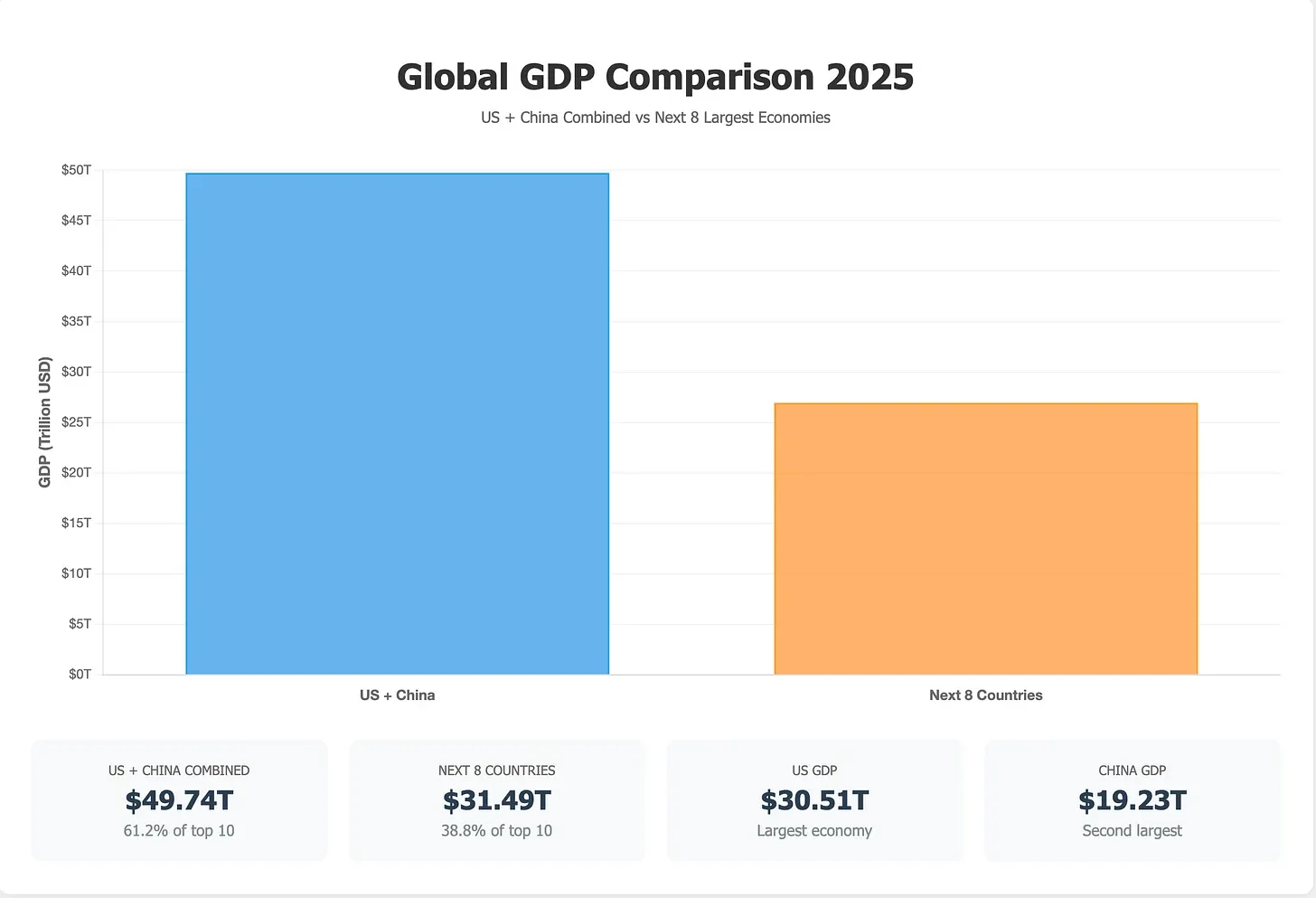 2. American Aspiration: Whether one likes it or not America along with China dominates the world. These two countries account for nearly half of global GDP and almost all of modern AI, Bio-Pharma, and Energy innovation in the world. The total GDP of the next 8 countries ( Germany, India, Japan, UK, France, Italy, Canada and Brazil) combined are that of the US and just over half of the US and China combined. America is now beginning to leverage its weight on its own behalf. And China is unstoppable. This reality is making the EU rethink its past assumptions and structures while creating new partnerships between all the other countries in the world looking to reduce their dependency on the two giants.