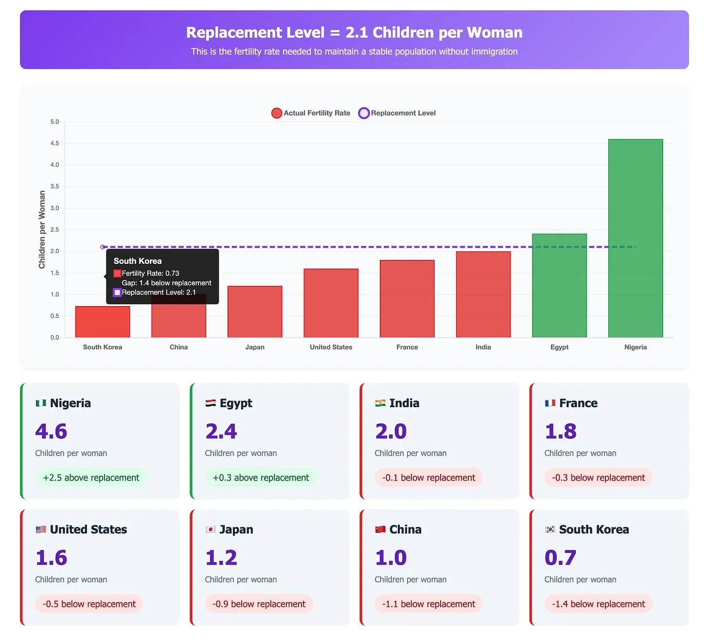 In every advanced economy, population is set to decline. It takes 2.1 children per woman to keep the population the same in any country. Today South Korea, Japan and China are suffering significant population declines and are likely to have half their current populations thirty or so years from now.