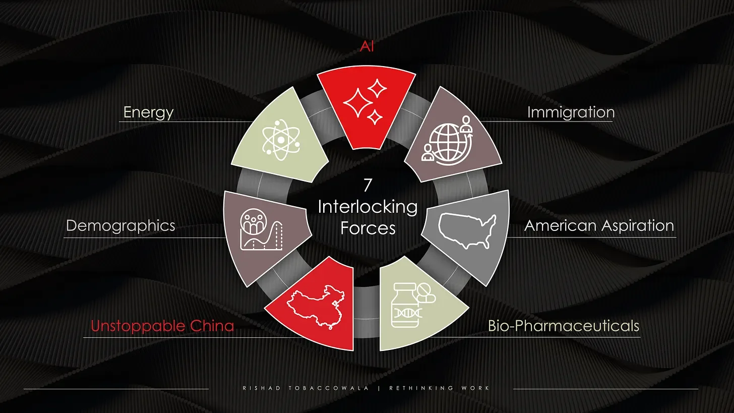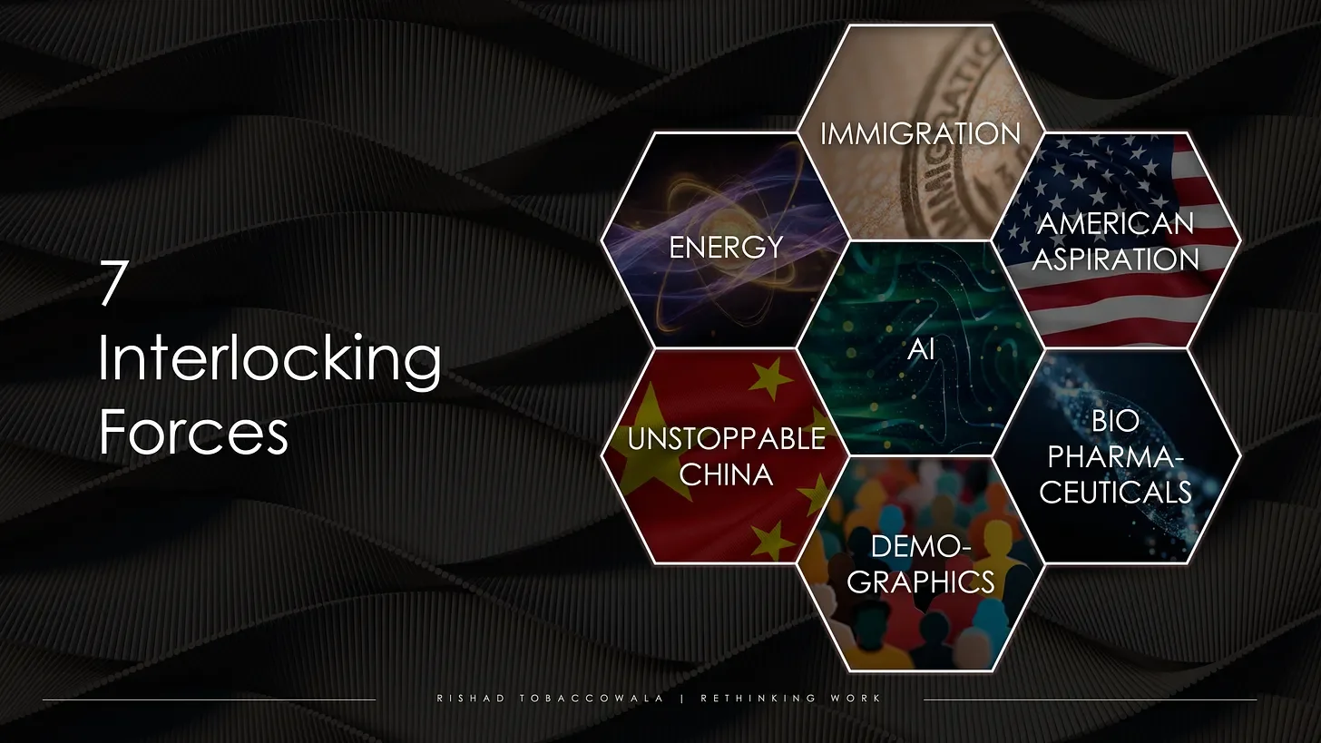 The Seven forces are AI, American Aspiration, Bio-Pharmaceuticals, China, Demographics, Energy and Immigration.