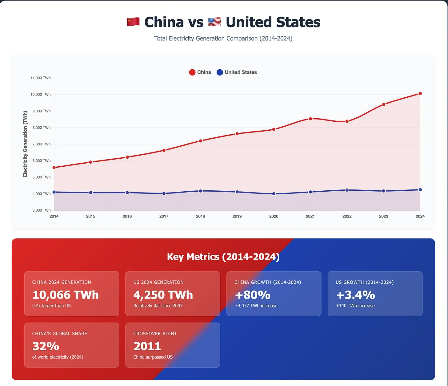 A key input for all the data centers that will be critical to AI is going to be electricity. China today produces 32 percent of all global electricity and 2.5 times the electricity produced by the United States. This cheap electricity combined with open weighted models driving Deep Seek, Qwen and other other Chinese foundational models might provide a long term edge vs. US foundational models.