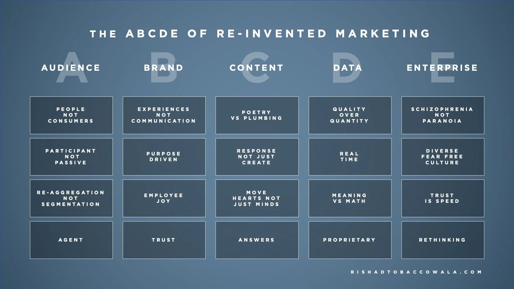 Clearly the challenges and opportunities facing companies are complex. Here is framework, the ABCDE of Re-invented Marketing, that attempts to simplify without dumbing down the key issues that we all have to face.